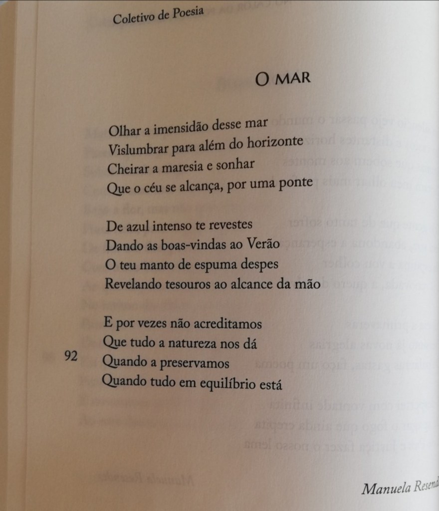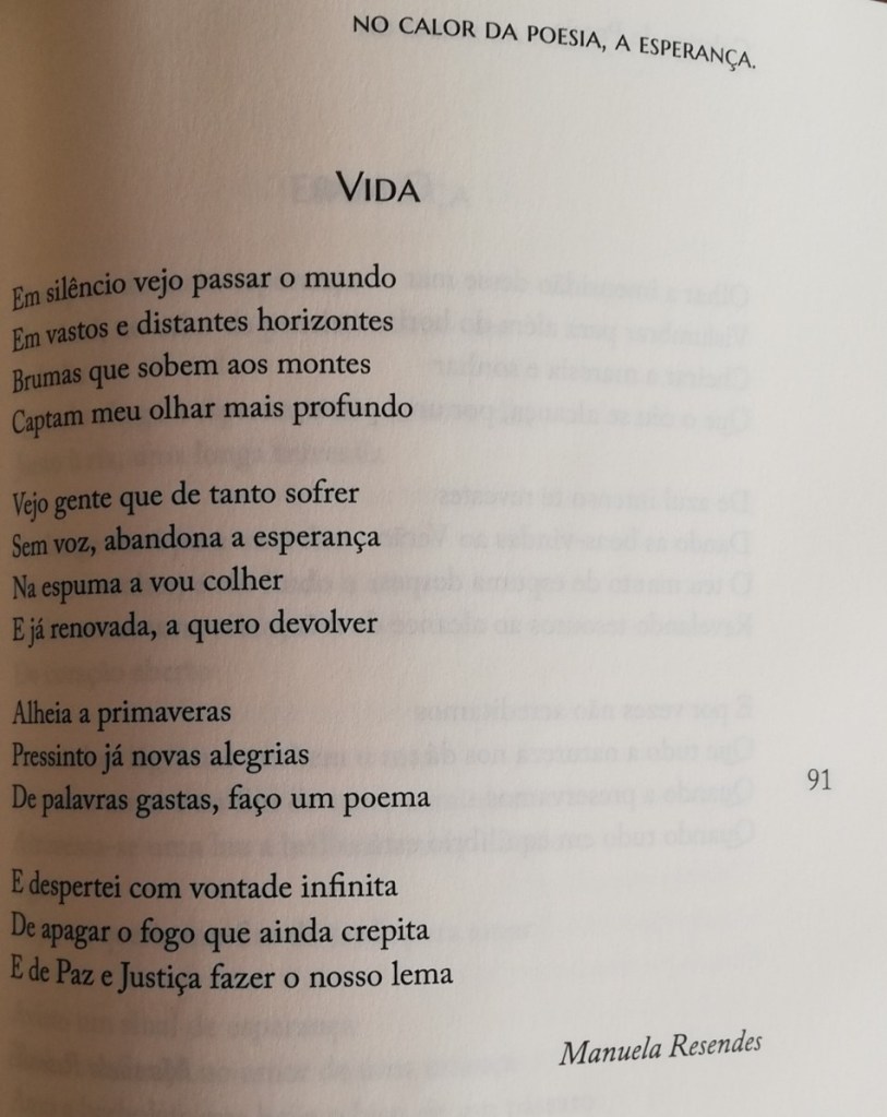 Assim foi com muita satisfação que vi selecionados dois poemas da minha autoria para serem incluídos no Coletivo de Poesia intitulado “No Calor da Poesia, A Esperança”, vol. 2, Edições Vieira da Silva.